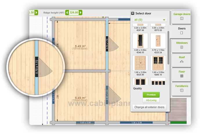 Cabinplanner© provides its user possibility of choosing different types of wood thickness, roof style, windows and doors and many other technical features which makes our configurator very convenient and versatile. Our configurator has user friendly interface and is made for intuitive use. We constantly work on developing our configurator to offer even more options and possibilities.